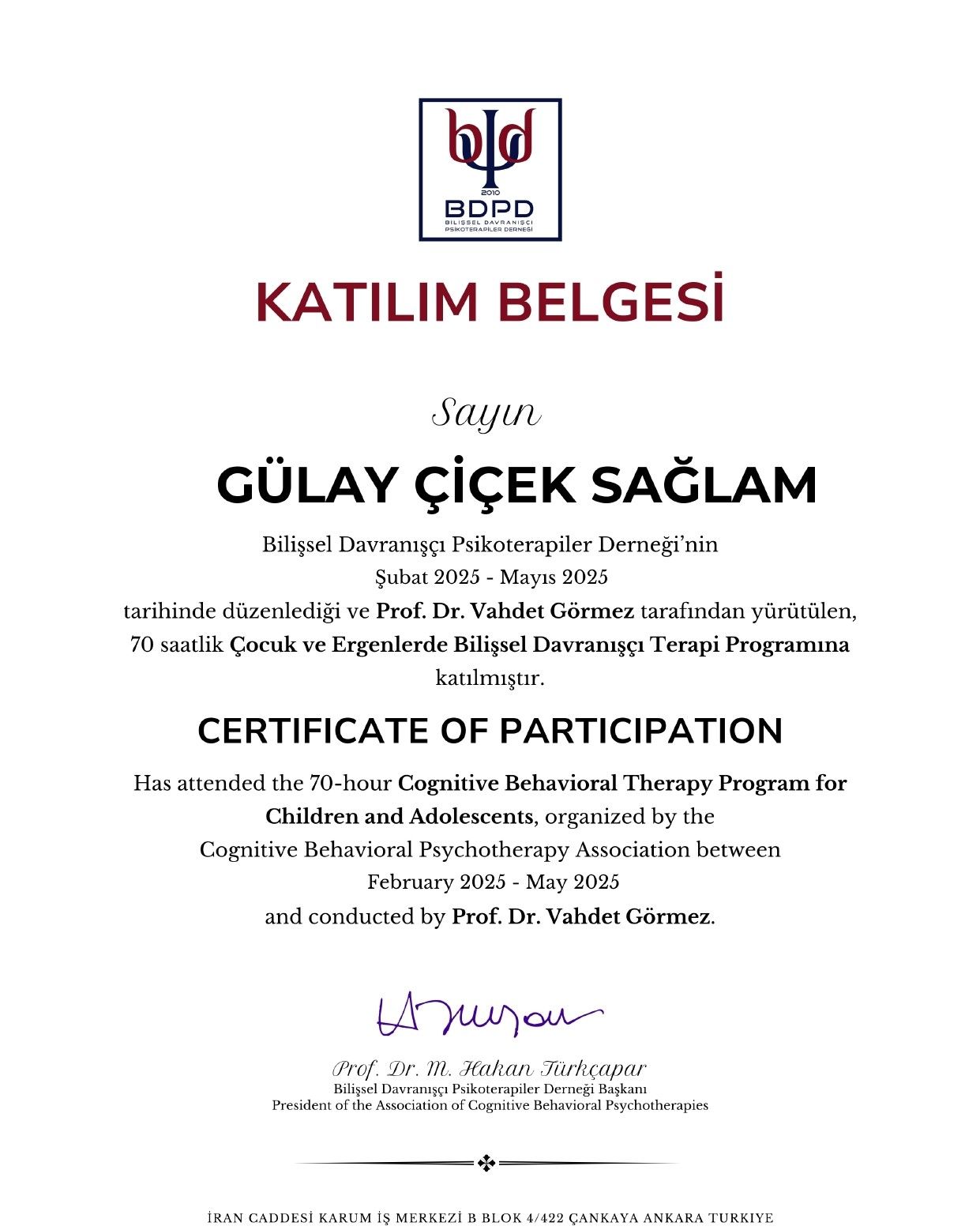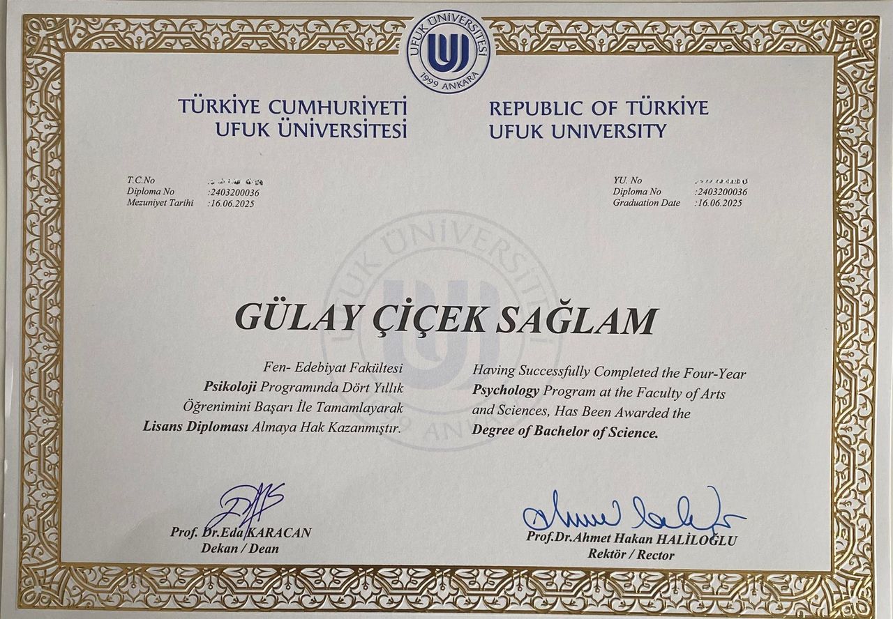 Ufuk üniversitesi psikoloji bölümünü onur öğrencisi olarak fakülte birinciliği ile bitirdim. Hacettepe üniversitesi psikiyatri kliniğinde stajımı yaptım. Psikoloji İstanbul Nilüfer devecigil'den Deneyimsel oyun terapisi eğitimimi aldım. POEM psikoloji Hakan Türkçapar koordinatörlüğünde Bilişsel Davranışçı Terapi (BDT) eğitimimi aldım. Türk Psikologlar Derneğinden "çocuk değerlendirme testleri" eğitimi, Moodist Akademiden "Nöropsikolojik testler" eğitimini, Nöropsikiyatri kapsamında çocuk ve yetişkin hastalıkları (DEHB, EPİLEPSİ VE ÇEŞİTLERİ, DEMANS, ALZHEİMER , PARKİNSON, FRONTAL LOB BEYİN HASARLARI KAYNAKLI HASTALIKLAR ve bu grup hastalıklarının tanılama ve tedavi süreçleri ile ilgili eğitimleri, Dil ve konuşma bozukluklarına genel bir bakış , Çocuk merkezli oyun terapisi eğitimlerimi tamamladım. ayrıca ICF onaylı öğrenci ve aile ilişkiler koçluğu eğitimlerimi de tamamladım.İstanbul Psikodrama enstitüsünün Psikodrama grup psikodrama eğitimine devam etmekteyim.